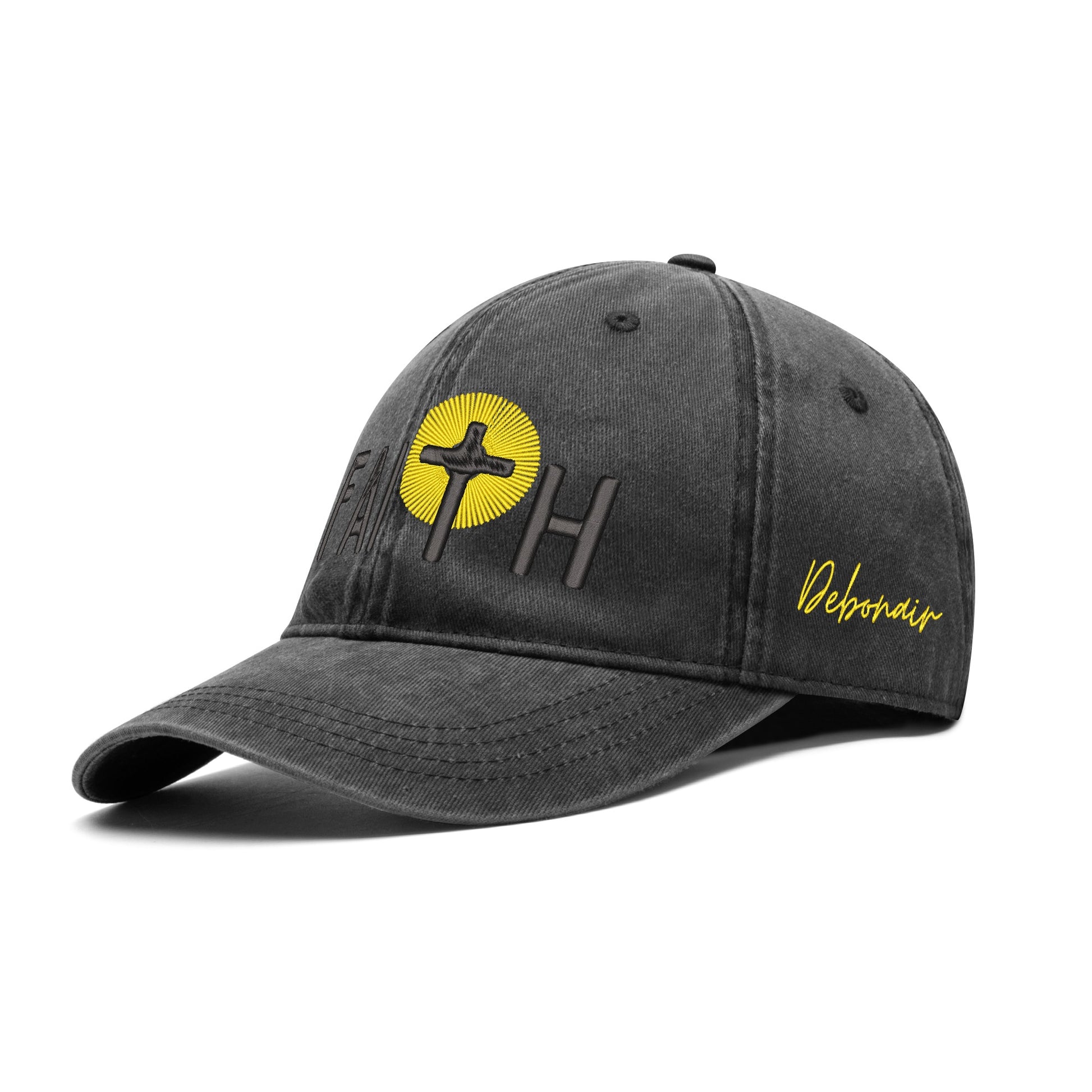 Inspire your beliefs with the stylish FAITH Embroidered Denim Baseball Cap. This contemporary piece features a sleek denim base with an embroidered "FAITH" graphic, perfect for making a statement of your spiritual beliefs. Get inspired and express it through style.